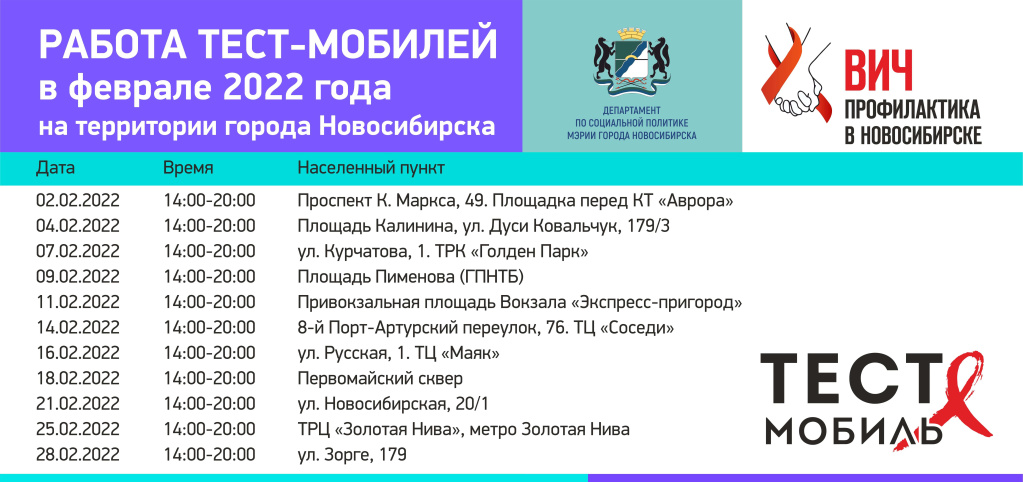 На территории города Новосибирска продолжается реализация проекта по профилактике ВИЧ-инфекции среди населения «Знаю! Уверен!». В рамках проекта проводится бесплатное тестирование на базе мобильной лечебно-профилактической клиники с использованием экспресс-тестов на ВИЧ и гепатит С, с предоставлением результата через 15 минут.