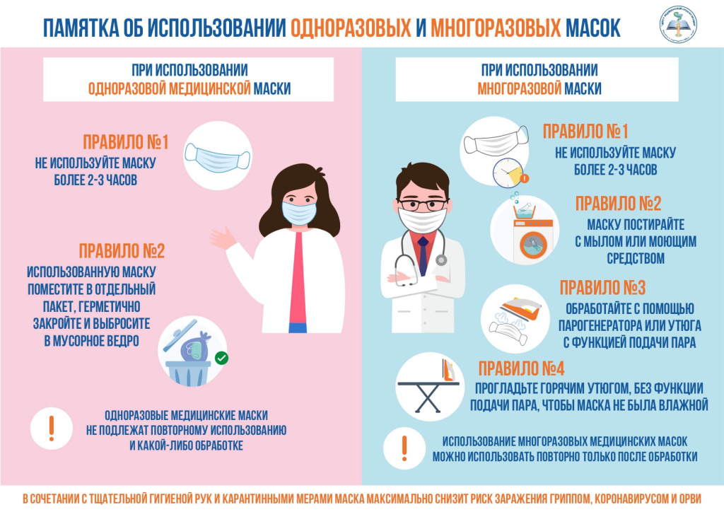 В период распространения новой коронавирусной инфекции COVID-19, гриппа и других возбудителей ОРВИ обязательно ношение маски в качестве меры профилактики заражения и ограничения распространения инфекции, так как эти вирусы передаются от человека к человеку воздушно-капельным путем, когда инфицированные люди говорят, чихают или кашляют.